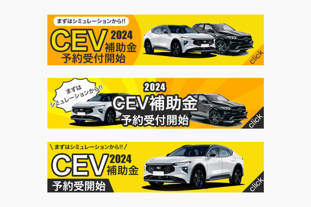 CEV補助金予約バナー 投稿日: 2024年2月11日2024年3月19日 投稿者: furuzono 制作日 :2024.2.11 前提条件: コーポレートサイト内に配置する補助金予約の誘導バナーの新調 希望配色 黄色やオレンジなど明るく元気な色 右下のclickボタンは必須